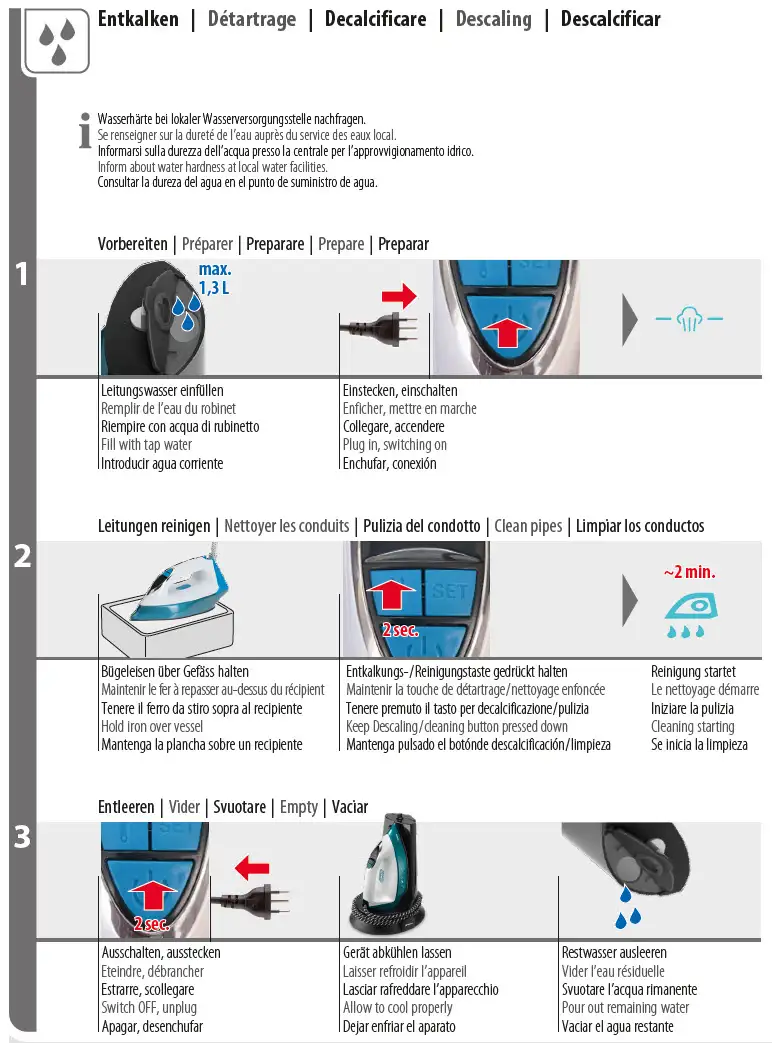 - 1.3 Liter Wassertank, Arretierfunktion für sicheren Halt des Bügeleisens