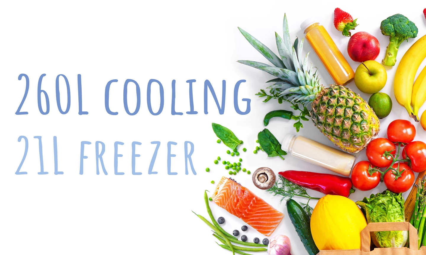 - Viel Platz mit 260 L Kühlraum (0°C - +10°C) und 21 L Gefrierfach (bis -18°C)