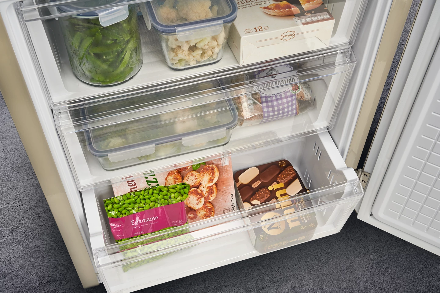 Der Trisa Retro-Kühlschrank "Frescolino Plus" verbindet nostalgischen Charme mit moderner Technik und wird so zum stilvollen Highlight in jeder Küche. Mit einer beeindruckenden Gesamtkapazität von 401 Litern bietet er reichlich Platz für alle Lebensmittel. Die Kühlabteilung umfasst grosszügige 250 Liter, während der Gefrierteil mit 151 Litern ebenfalls viel Stauraum bereithält. Die verchromten Griffe und abgerundeten Kanten verleihen dem Kühlschrank eine elegante Retro-Optik, die perfekt in moderne Küchenumgebungen passt. Dank der No-Frost-Technologie mit ihrem speziellen Belüftungssystem wird die lästige Eisbildung verhindert und für stets optimale Lagerbedingungen gesorgt. Die innovativen Super-Cool und Super-Freeze Modi ermöglichen es, frische Lebensmittel schnell auf die gewünschte Temperatur zu bringen und ihre Frische optimal zu bewahren. Diese Funktionen sind besonders praktisch nach grösseren Einkäufen oder bei der Vorbereitung von Festessen. Die Temperaturregelung für die Kühl- und Gefrierabteilungen erfolgt unabhängig voneinander und kann über ein übersichtliches LED-Display eingestellt werden. Dadurch wird gewährleistet, dass alle Lebensmittel immer bei der optimalen Temperatur gelagert werden. Der Trisa Retro-Kühlschrank ist nicht nur ein funktionales Küchengerät, sondern auch ein stilvolles Design-Statement. Die Kombination aus grossem Stauraum, moderner Technik und nostalgischem Design macht ihn zum idealen Begleiter für alle, die Wert auf Ästhetik und Effizienz legen. Ein echtes Raumwunder für die moderne Küche.