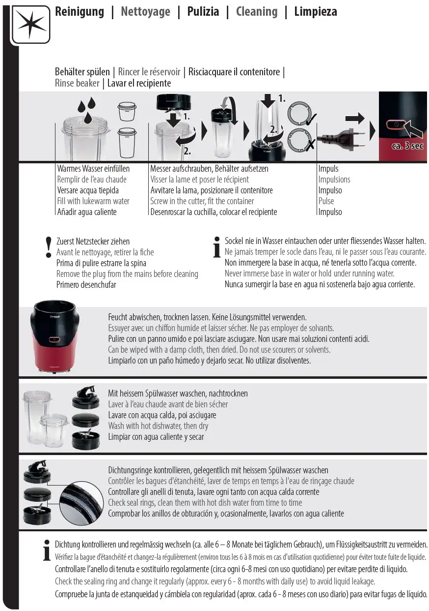 Verwenden Sie ausschliesslich Originalbehälter - und Aufsätze. Fügen Sie trockenen oder gefrorenen Lebensmittel etwas Flüssigkeit in Form von Wasser oder Milch hinzu, um das Mixergebnis zu verbessern.