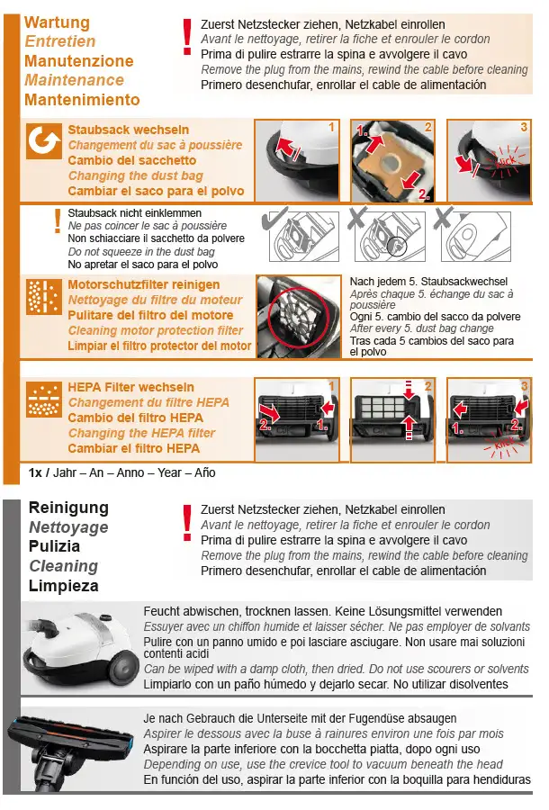 The Comfort Clean T3788 delivers effortless cleanliness throughout your home. Thanks to the high-quality universal floor nozzle with practical air sliders, you can adjust the suction power to your needs. With a 7 m power cord and an 11 m operating radius, you can clean large areas quickly and comfortably. For hygienic cleanliness, the T3788 is equipped with a HEPA filter and a practical dust bag. While the filter reliably captures dust, pollen and allergens, the bag ensures simple and clean disposal. This way, your home stays not only spotless but also the air hygienically fresh. The proven click system with ergonomic telescopic tube guarantees comfortable handling, while the stepless suction power control gives you full command at all times. With the 2-in-1 crevice tool, you can also clean hard-to-reach spots or upholstery with ease. And thanks to the integrated park system, you can safely set down the T3788 during short breaks or store it compactly after vacuuming. The Comfort Clean T3788 combines efficient cleaning performance with thoughtful operating comfort – for a home where you can truly feel at ease.