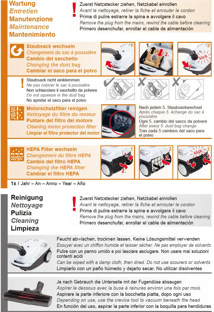 Grande puissance d'aspiration, roues douces pour protéger les sols et nettoyage hygiénique grâce au filtre HEPA.
