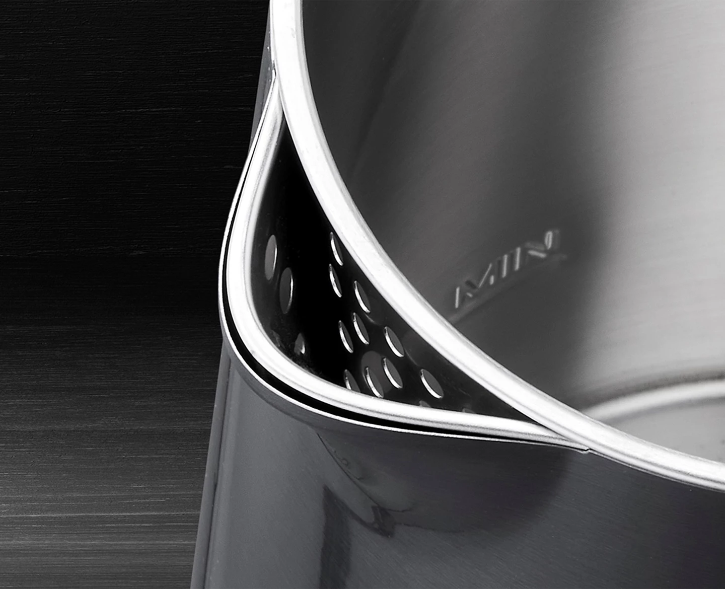 La bouilloire à double paroi "Comfort Touch" garantit une manipulation sûre. La double protection contre la chaleur protège des brûlures inesthétiques en cas de contact accidentel avec le corps de la bouilloire. Cette protection sert en outre à la fonction d'isolation. Cela permet de faire bouillir l'eau plus rapidement et en économisant de l'énergie, car la chaleur reste à l'intérieur. La construction innovante à double paroi en acier inoxydable de haute qualité dispose du système éprouvé d'arrêt automatique Strix-Control (protection contre la surchauffe et la marche à sec) avec éclairage LED. Le socle à 360° promet une liberté de mouvement totale sans câble gênant, qui peut être enroulé dans le socle. Le nettoyage est particulièrement simple et pratique – le boîtier est entièrement en acier inoxydable et le filtre y est intégré.
