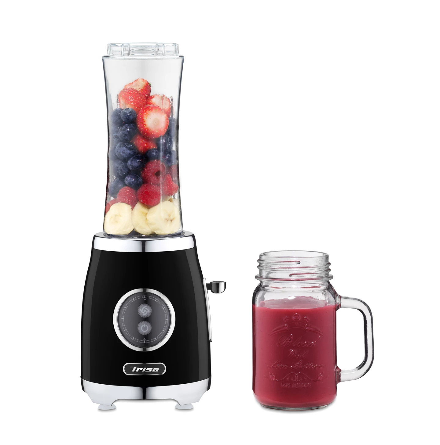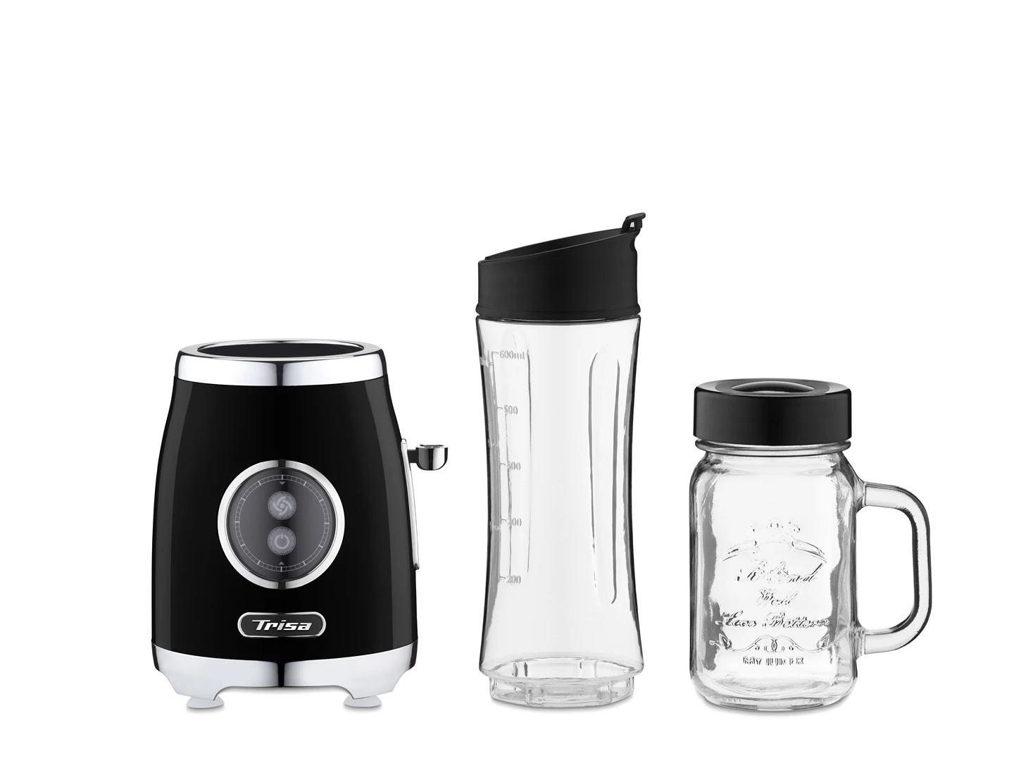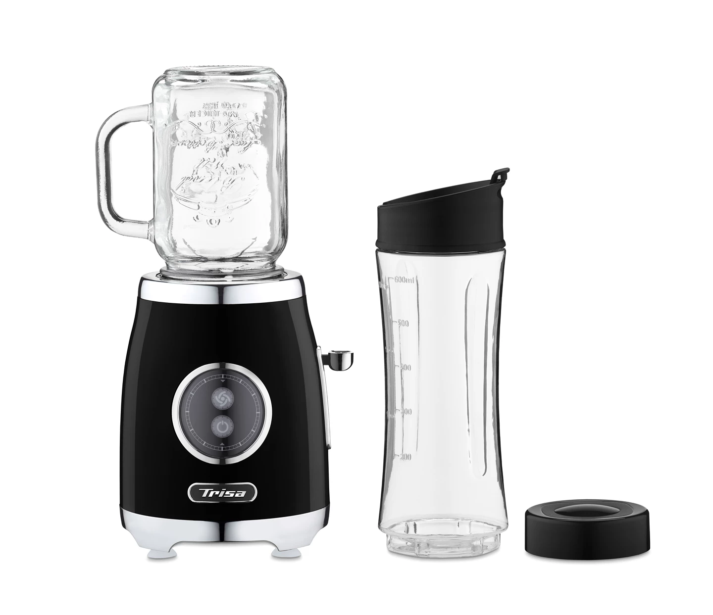 Avec ce mixeur sur socle, vous pouvez préparer rapidement et facilement de délicieux smoothies. Vous coupez les fruits ou les légumes mous en petits morceaux, vous les versez directement dans le bocal avec poignée ou la bouteille, vous mixez les ingrédients et la boisson est prête à être dégustée. Vous gagnez ainsi du temps dans la préparation et le nettoyage. Le blender s'utilise sans effort grâce à un bouton à impulsion. Le puissant moteur de 21 000 tr/min mélange, mixe et réduit en purée les ingrédients en quelques secondes. La livraison comprend un bocal avec poignée en verre de haute qualité (500 ml) dans un style rétro tendance et une bouteille en Tritan robuste (600 ml) - particulièrement pratique pour les "smoothie-on-the-go ". Deux couvercles, avec et sans ouverture pour boire, sont également fournis. Pour conserver la boisson au réfrigérateur ou pour la transporter en toute sécurité lors de vos déplacements. Les accessoires s'emboîtent les uns dans les autres et bien sûr sur le blender. Le design compact est particulièrement peu encombrant : le blender sans accessoire ne mesure que 16 cm de haut. Le verre de la poignée, la bouteille et les couvercles sont également compatibles avec le lave-vaisselle.
