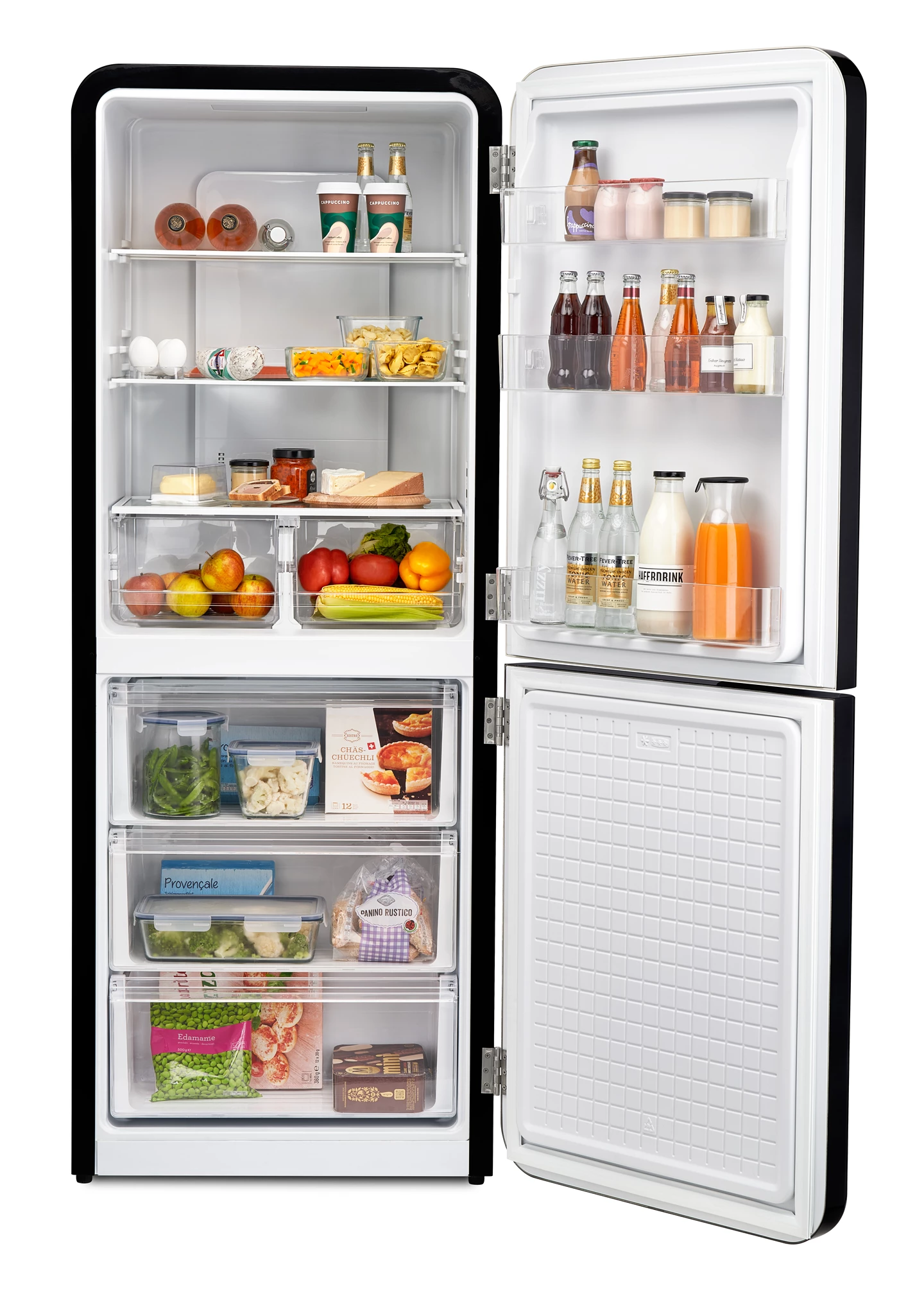 Il frigorifero retrò Trisa "Frescolino Plus" combina il fascino nostalgico con la tecnologia moderna, diventando un punto culminante elegante in ogni cucina. Con una capacità totale impressionante di 401 litri, offre molto spazio per tutti i generi alimentari. La sezione del frigorifero comprende 250 litri generosi, mentre la sezione del congelatore offre ampio spazio di stoccaggio con 151 litri. Le maniglie cromate e i bordi arrotondati conferiscono al frigorifero un aspetto retrò elegante, che si adatta perfettamente agli ambienti della cucina moderna. Grazie alla tecnologia No-Frost con il suo sistema di ventilazione speciale, viene evitata la fastidiosa formazione di ghiaccio, garantendo condizioni di conservazione ottimali. Le modalità innovative Super-Cool e Super-Freeze consentono agli alimenti freschi di essere rapidamente portati alla temperatura desiderata, preservandone la freschezza in modo ottimale. Queste funzioni sono particolarmente utili dopo grandi acquisti o nella preparazione di cene festive. Il controllo della temperatura per le sezioni del frigorifero e del congelatore è indipendente e può essere impostato tramite un display LED chiaro. Questo garantisce che tutti gli alimenti siano sempre conservati alla temperatura ottimale. Il frigorifero retrò Trisa non è solo un elettrodomestico da cucina funzionale, ma anche una dichiarazione di design elegante. La combinazione di ampio spazio di stoccaggio, tecnologia moderna e design nostalgico lo rende il compagno ideale per chi apprezza l'estetica e l'efficienza. Un vero miracolo di spazio per la cucina moderna.
